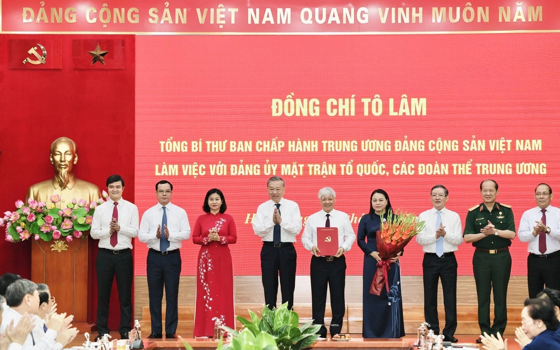 Tổng Bí thư Tô Lâm trao Quyết định về thành lập Đảng bộ, tổ chức bộ máy, chức năng nhiệm vụ và chỉ định Bí thư, các Phó Bí thư Đảng uỷ Mặt trận Tổ quốc Việt Nam, các đoàn thể Trung ương nhiệm kỳ 2020-2025. Ảnh: Báo Nhân dân