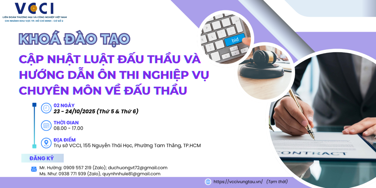 Nhằm mục đích giúp doanh nghiệp và các đơn vị nhanh chóng cập nhật, nắm bắt được các quy định mới của Luật đấu thầu số 90/2025/QH15 và Nghị định 214/2025/NĐ-CP quy định chi tiết hướng dẫn Luật Đấu thầu về lựa chọn nhà thầu có hiệu lực từ ngày 04/8/2025 và Hướng dẫn ôn thi chứng chỉ Nghiệp vụ chuyên môn về đấu thầu. VCCI Khu vực Thành phố Hồ Chí Minh – Cơ sở 2 thông báo tổ chức khóa đào tạo: